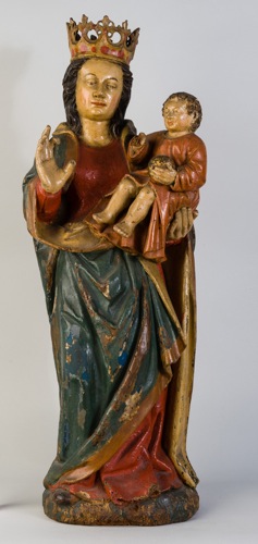 L'attribut (un fruit?) que la Vierge tenait a disparu ; l'Enfant présente un globe, symbole de sa royauté sur la Terre.