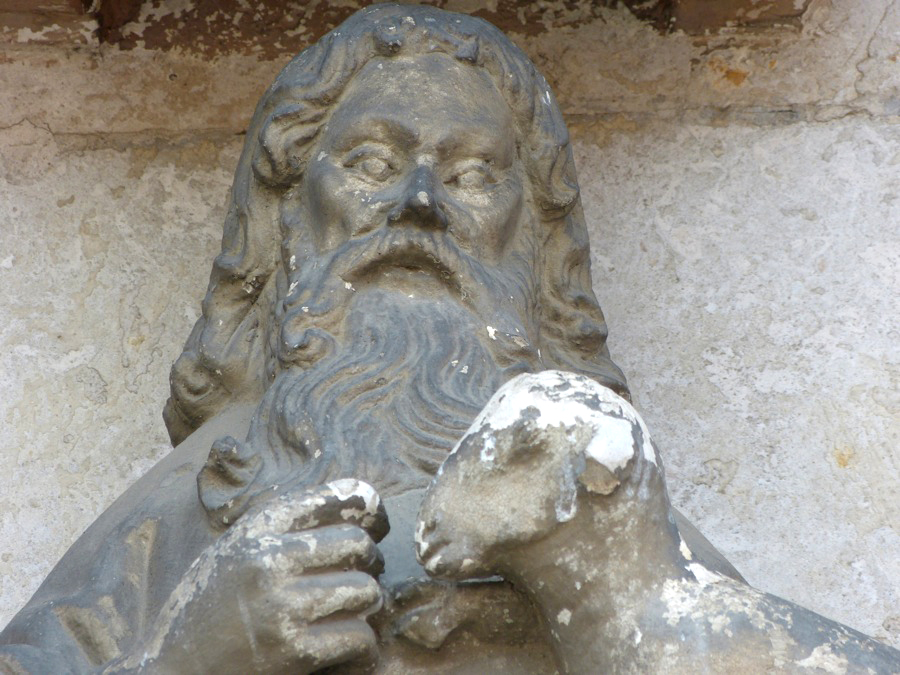 La statue du Bon Pasteur (Saint Jean-Baptiste) au tympan de l'église de Saint-Jean-Pied-Gauthier
