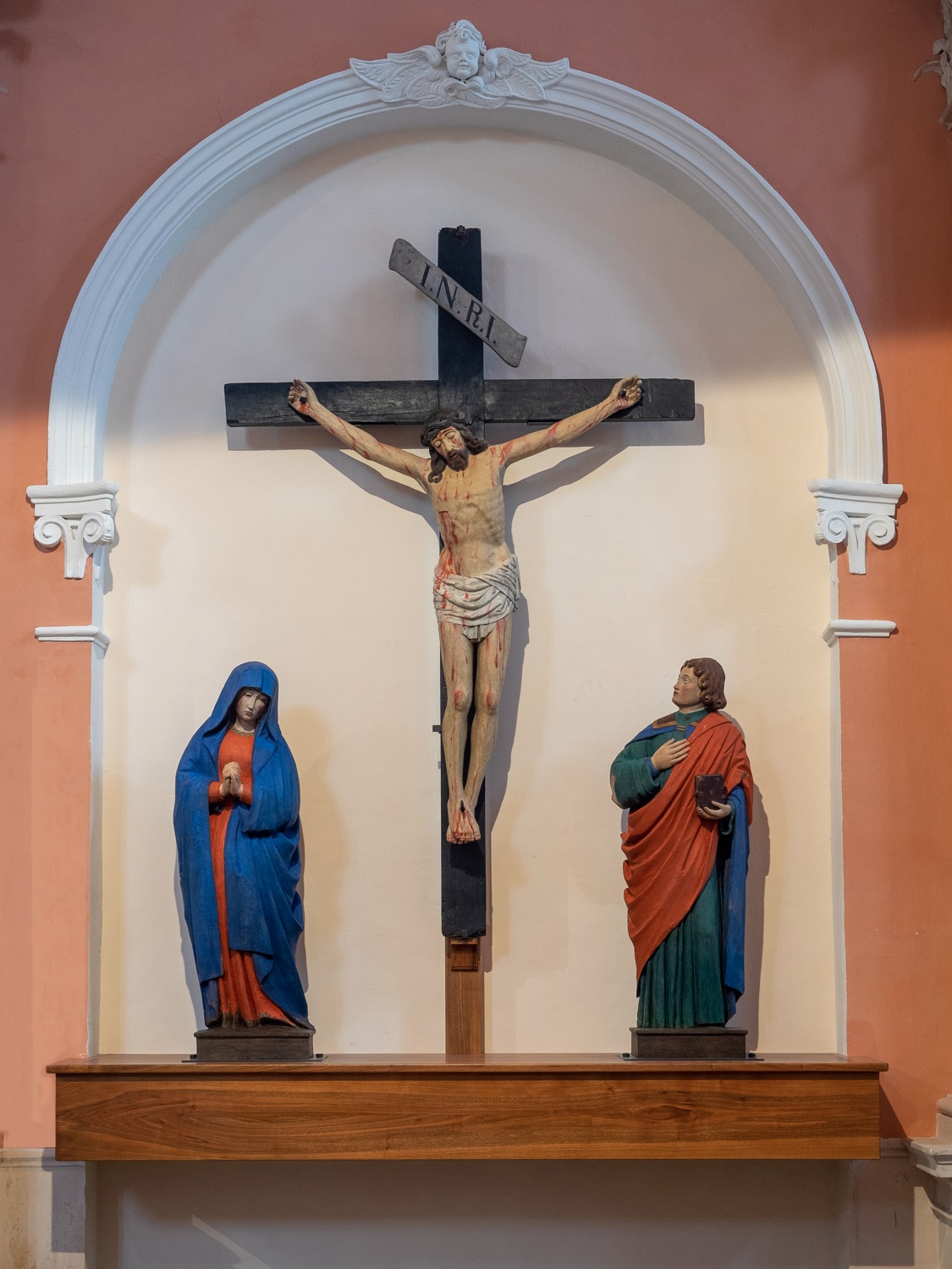 3 volumes distincts : la Vierge, Jean l'Évangéliste, posés au sol, et le Christ en Croix, suspendu en hauteur (la croix a été refaite par le passé).