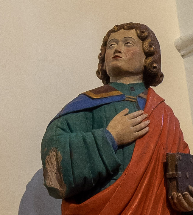 Par ailleurs, Jean présente des détails stylistiques très proches de la statuaire "savoyarde" : quoique le visage paraisse plus juvénile, il a l'attitude et les traits du "saint-Jean-l'évangéliste" du Calvaire de Moutiers, ou de celui de la "Piéta de saint-Offenges dessus", avec le jeu de boucles de cheveux si caractéristique, et une structure semblable du visage .