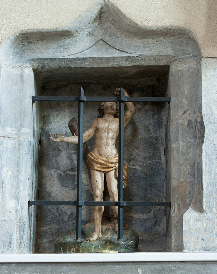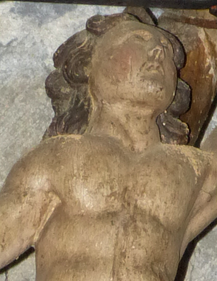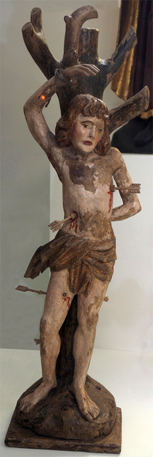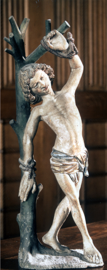 On peut donc reconnaître saint Sébastien, ainsi représenté - mais généralement criblé de flèches par ses compagnons d'armes ; c'est même cette forme de supplice qui, par analogie, a fait de ce martyre le protecteur des pesteux : la crainte bien justifiée de ce fléau explique son succès (comme celui de saint Roch) jusqu'à l'époque moderne.