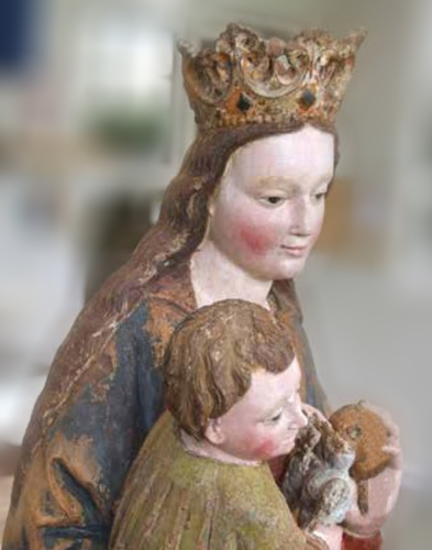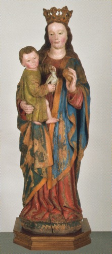 La Vierge tient une poire, l'Enfant un oiseau.