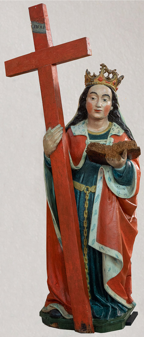 Sculpture bois taillé, peint (polychrome), avec ses attributs : la sainte Croix, la couronne et le manteau impériaux, et emplacement probable d'une relique dans la partie haute de la croix.